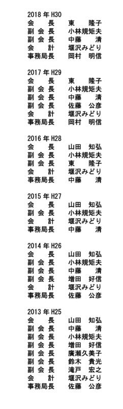 主要役員(2019 年度) 2019フレッシュリーダー養成事業 2019 NLCについて 2019 砂の造形大会 2019 子どもの遊び王国in沼津 2019 球技大会 2020.3新理事セミナー新世話人研修会【中止】 2020.3フレッシュリーダー講習会【中止】 沼子連だより こぶし Vol.38 主要役員(2018 年度以前)